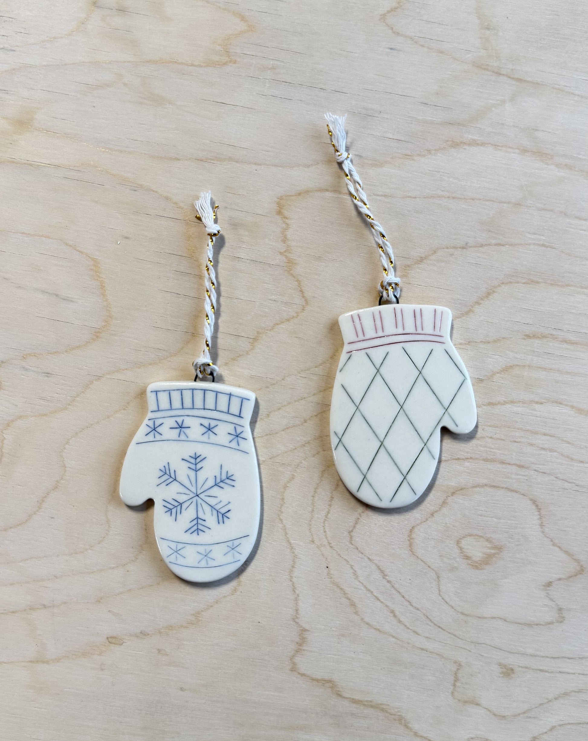 These porcelain mitten ornaments are illustrated by hand, making each one unique. They are carved, then inlaid with red and green underglaze before finishing with a clear glossy glaze. This ornament comes in two variations and can also be purchased as a pair.