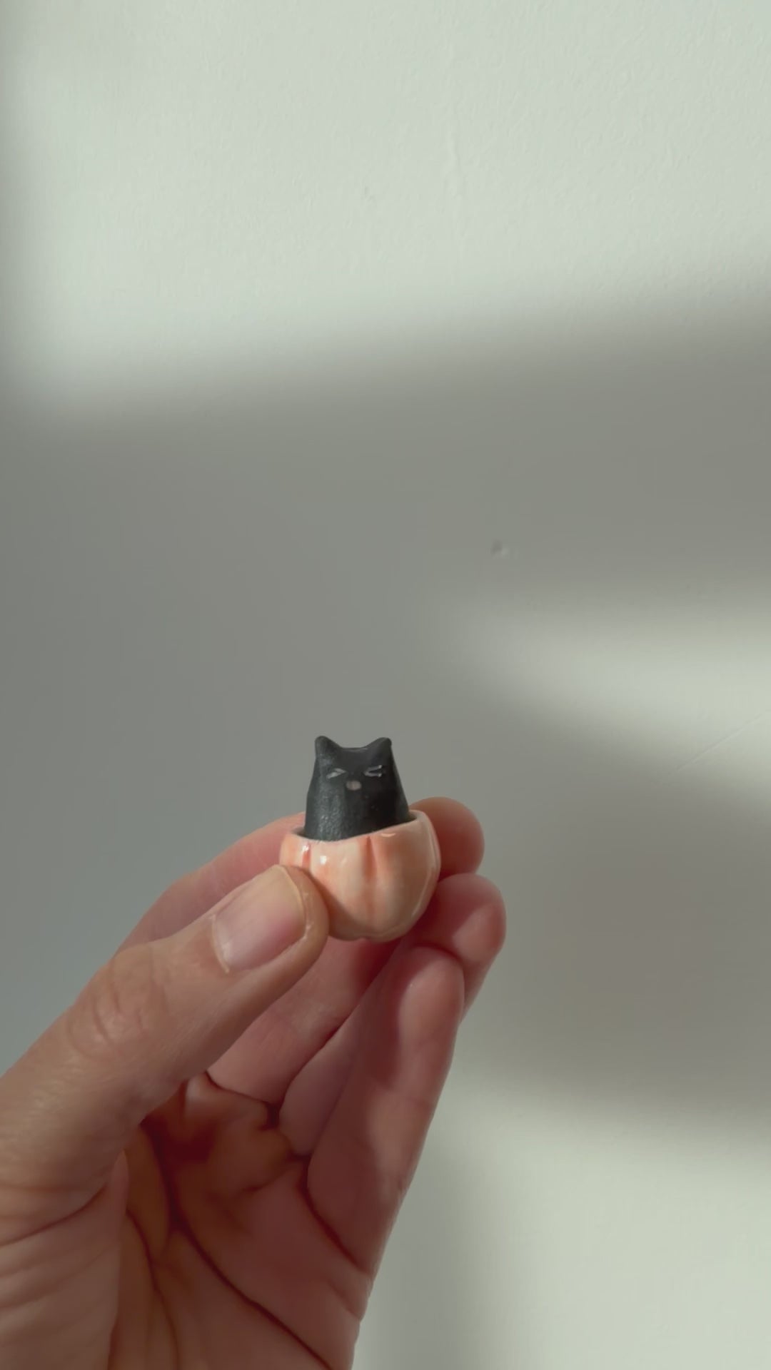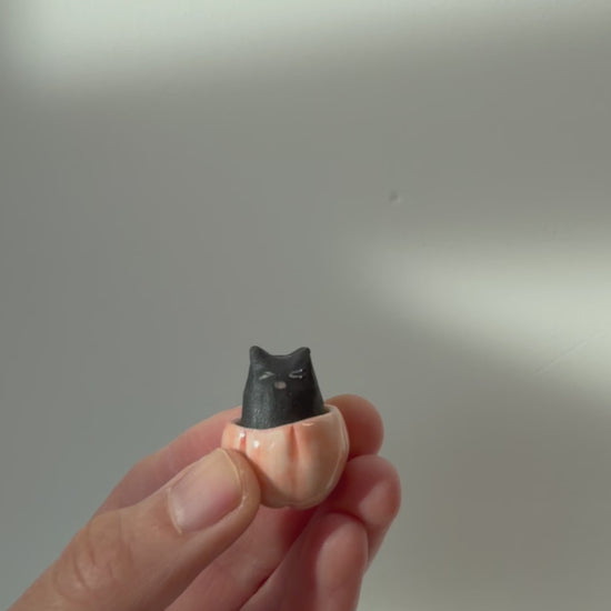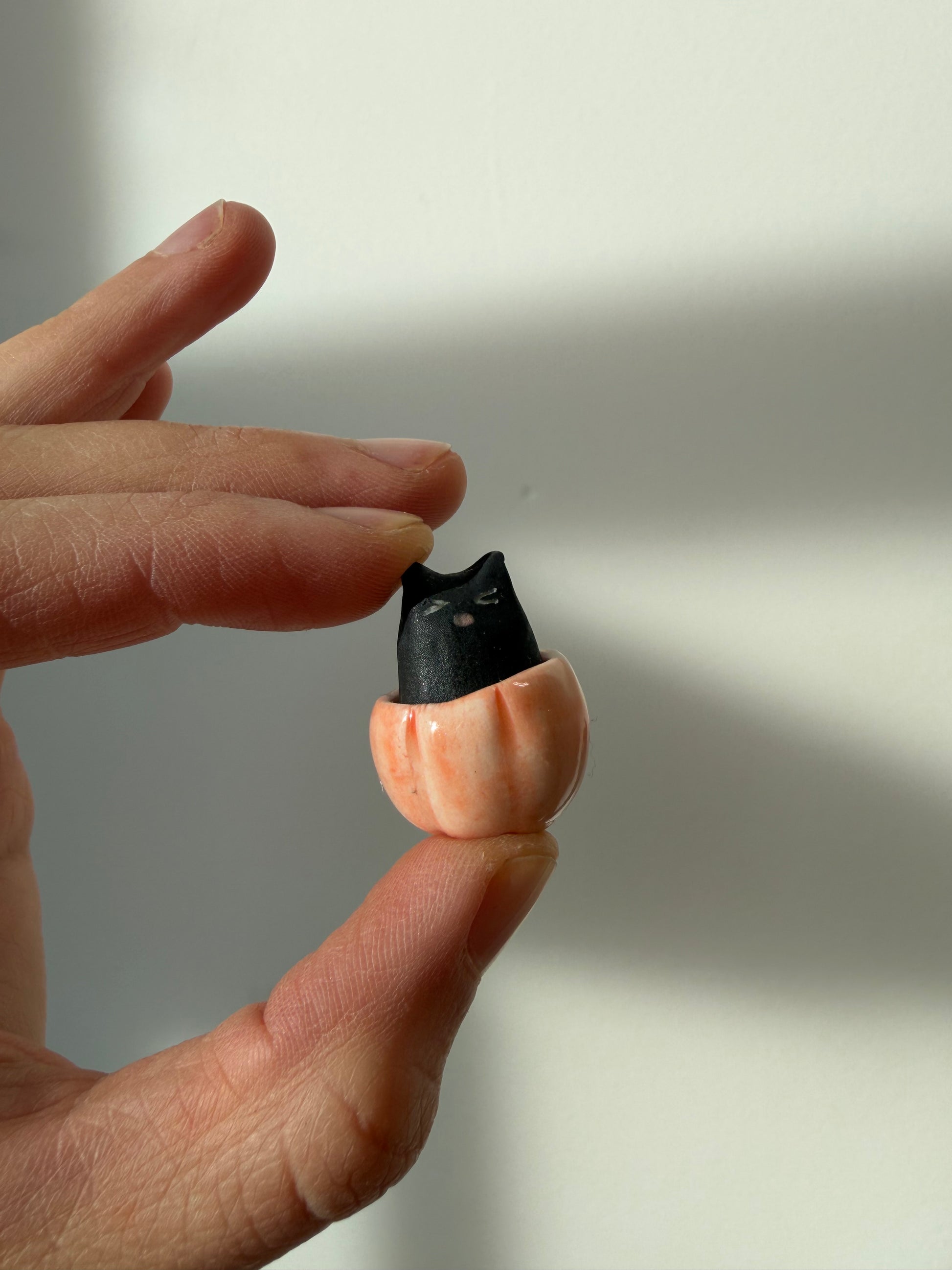 Welcome the changing season in style--this miniature celebrates autumn with a sweet+spooky black cat sitting in an orange pumpkin! With hand painted detail and a cute squinty face, these cats are perfect for fall. Ranging from 3/4 to 1 inch, each is handmade and unique.