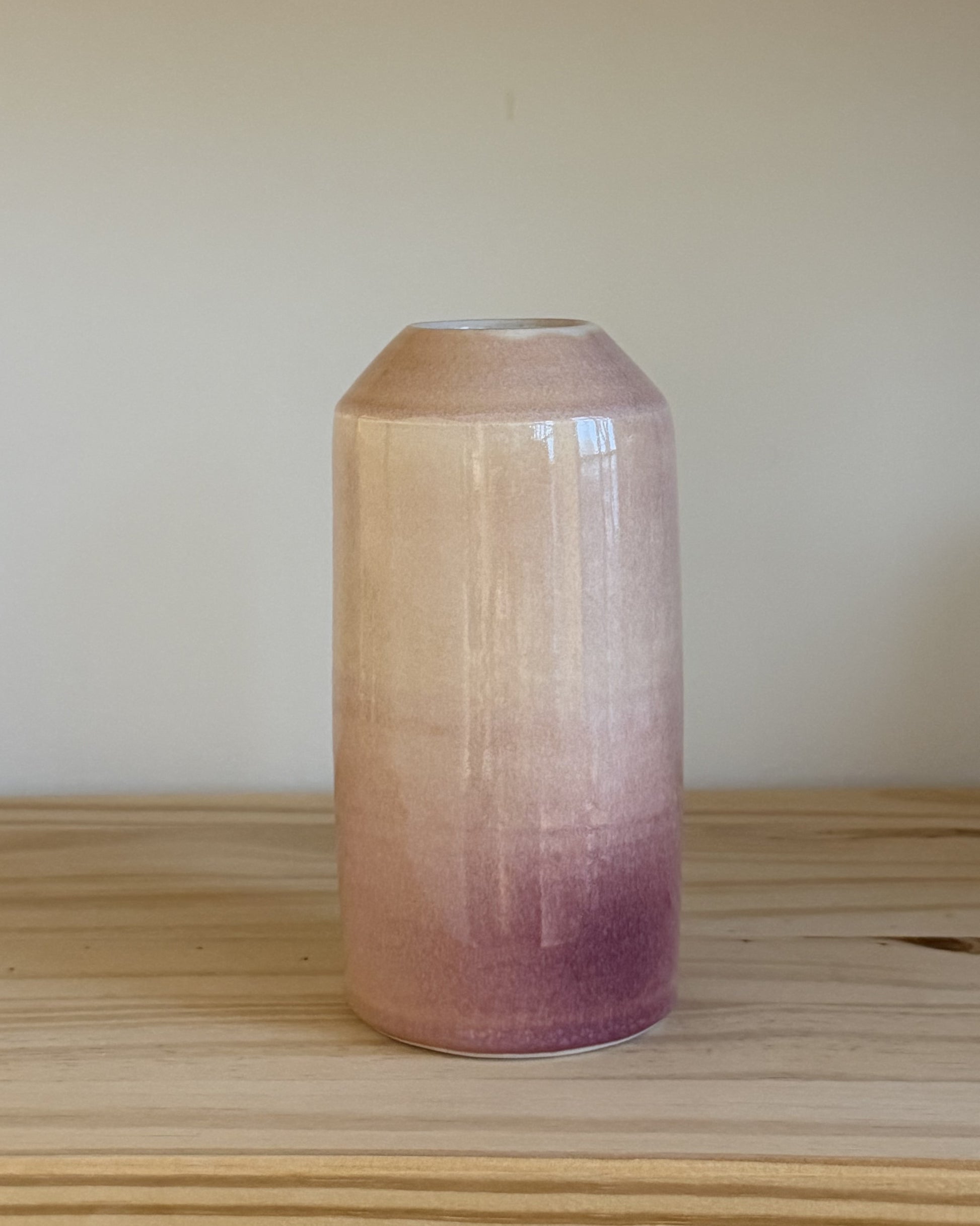 C: Dipped in Blush, our pinky/peachy glossy glaze--this vase leans pink. Measures approximately 6.25" tall and 2.25" wide