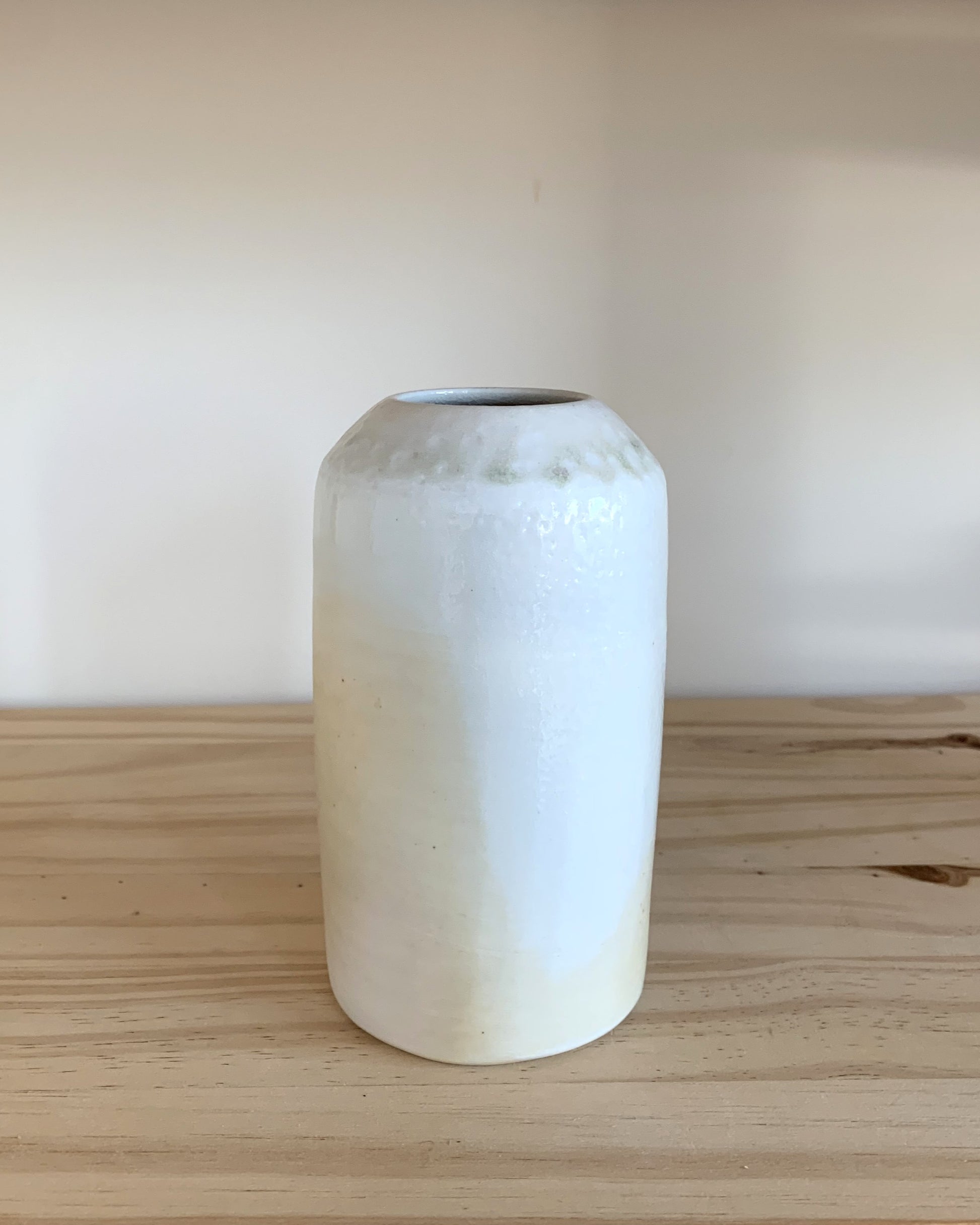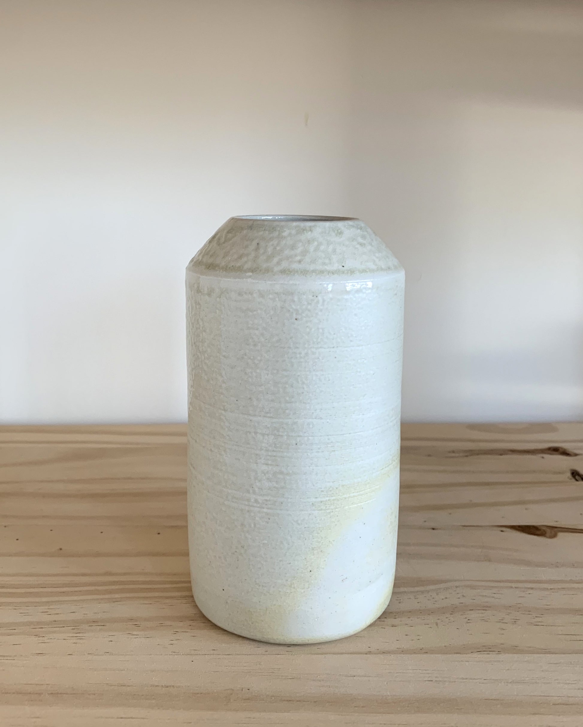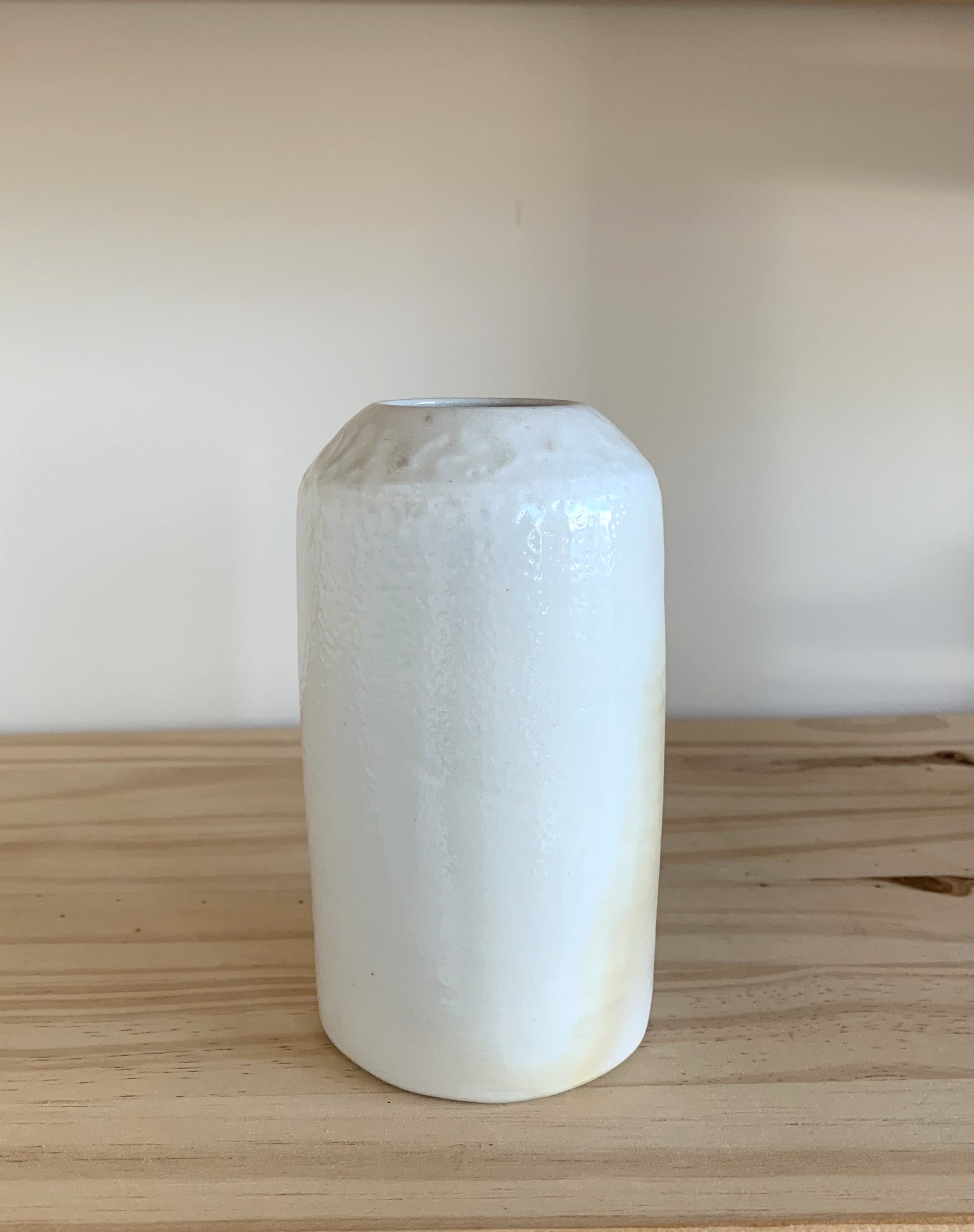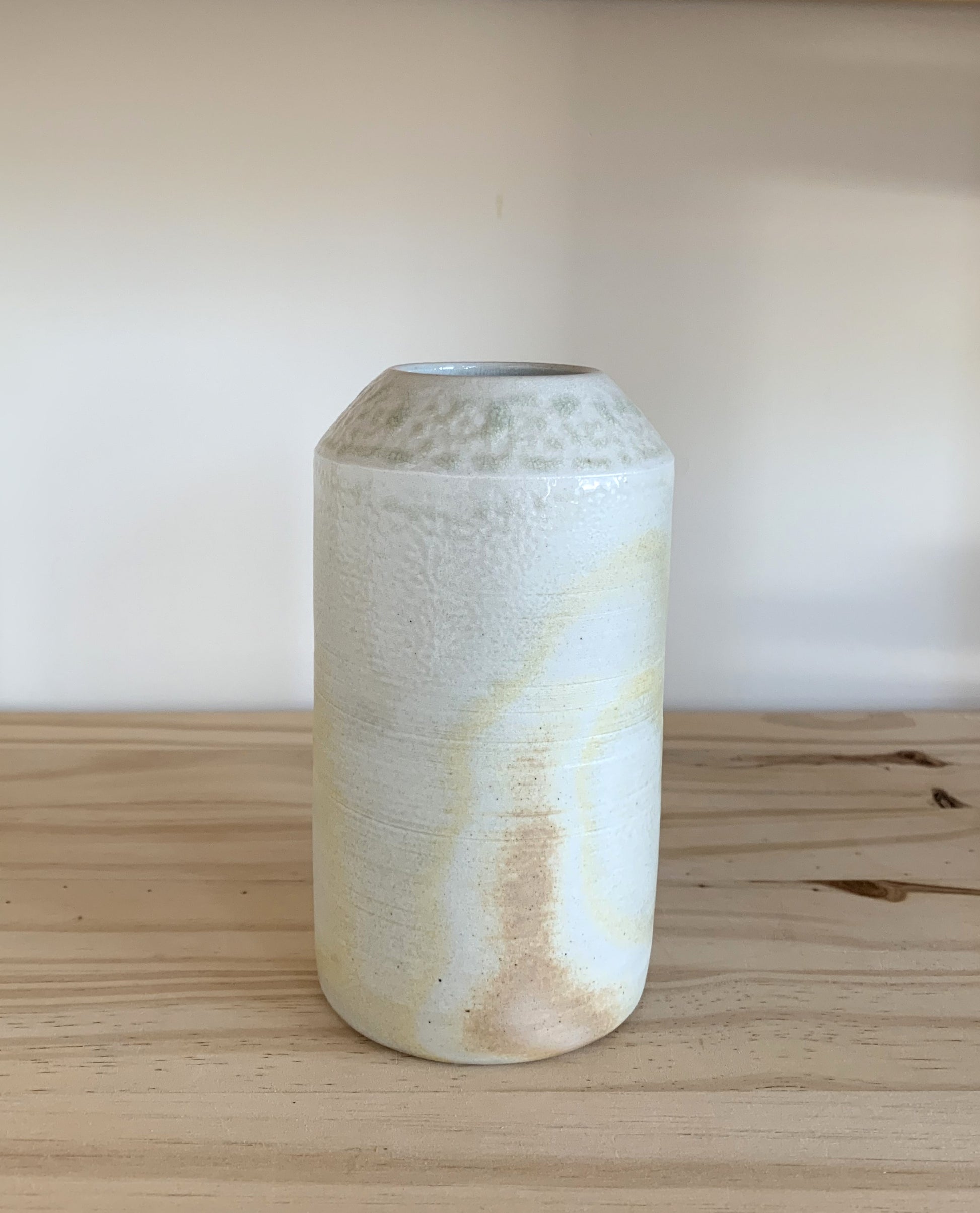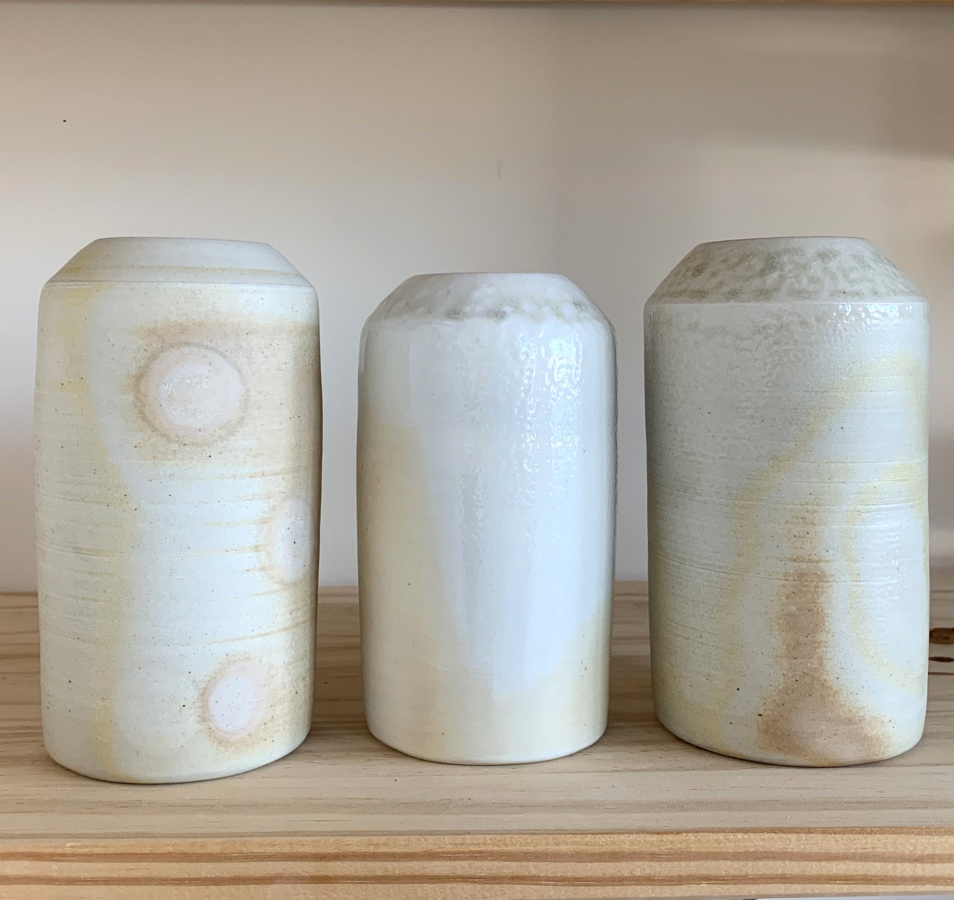 These porcelain wood fired column vases are part of our special wood fired collection. Hand crafted on the pottery wheel, these vases are fired in a special wood powered kiln to give the unique color palette. The colors and shine are the effect of wood ash, flame, and soda vaporizing in the kiln, travelling on the flames and landing on pots throughout the kiln. Due to this unique way of firing, each piece is 100% unique and cannot be replicated. These vessels are earthy, subtle and beautifully organic.
