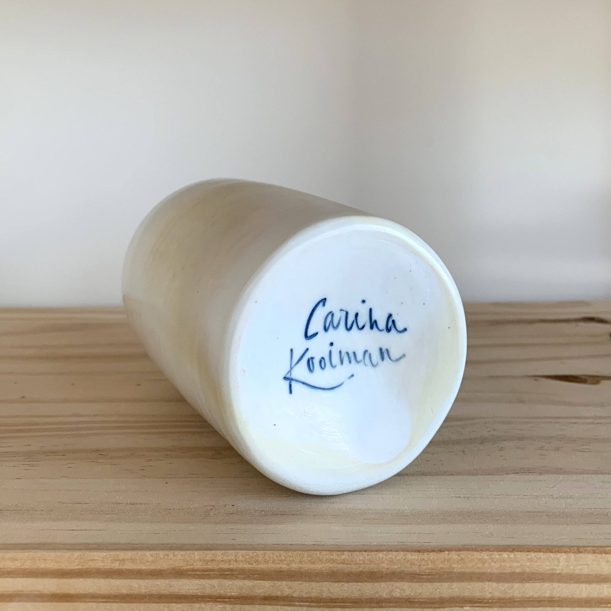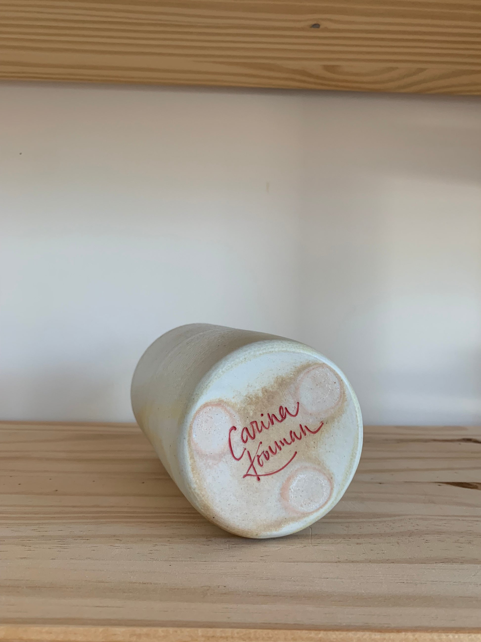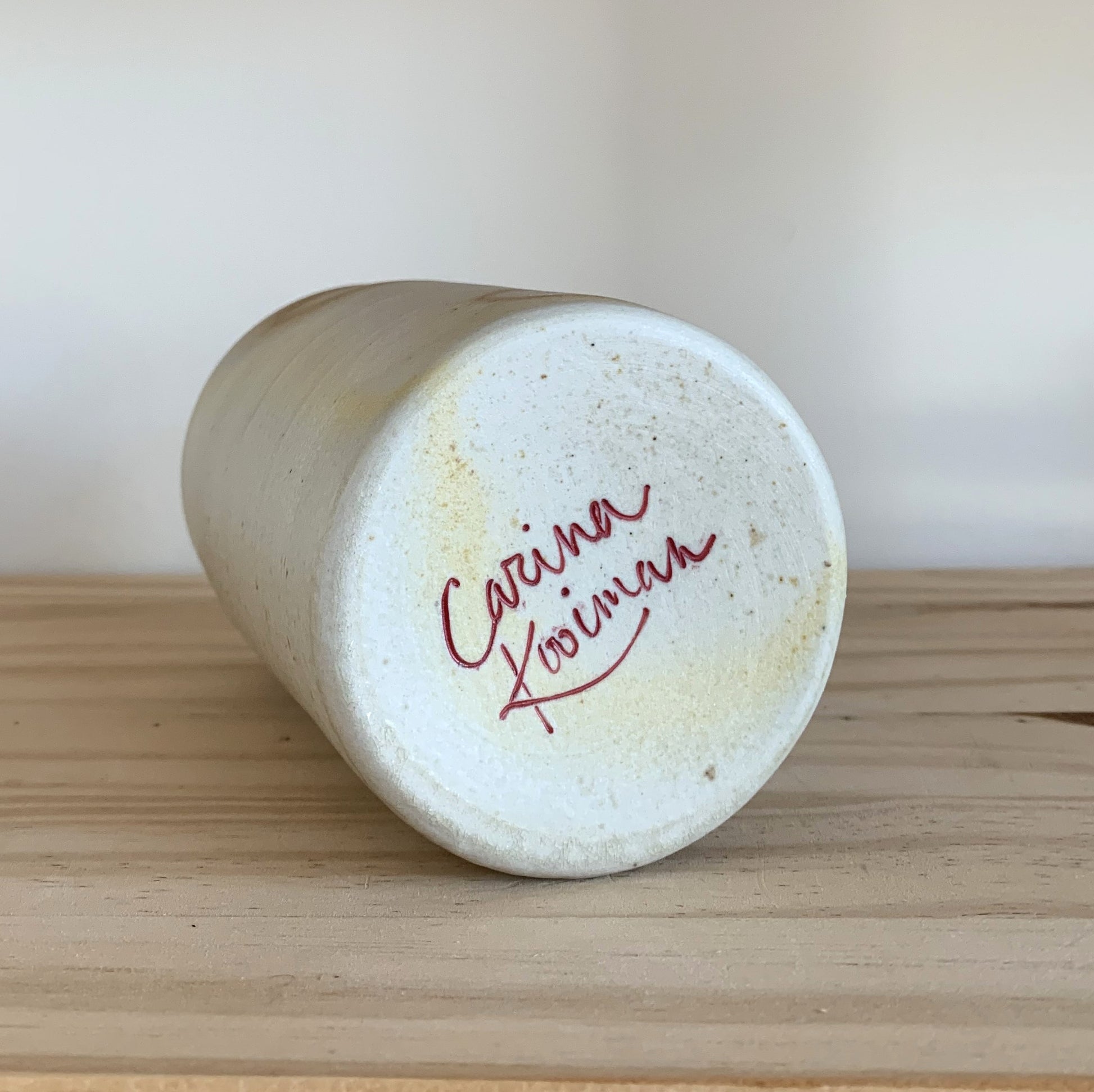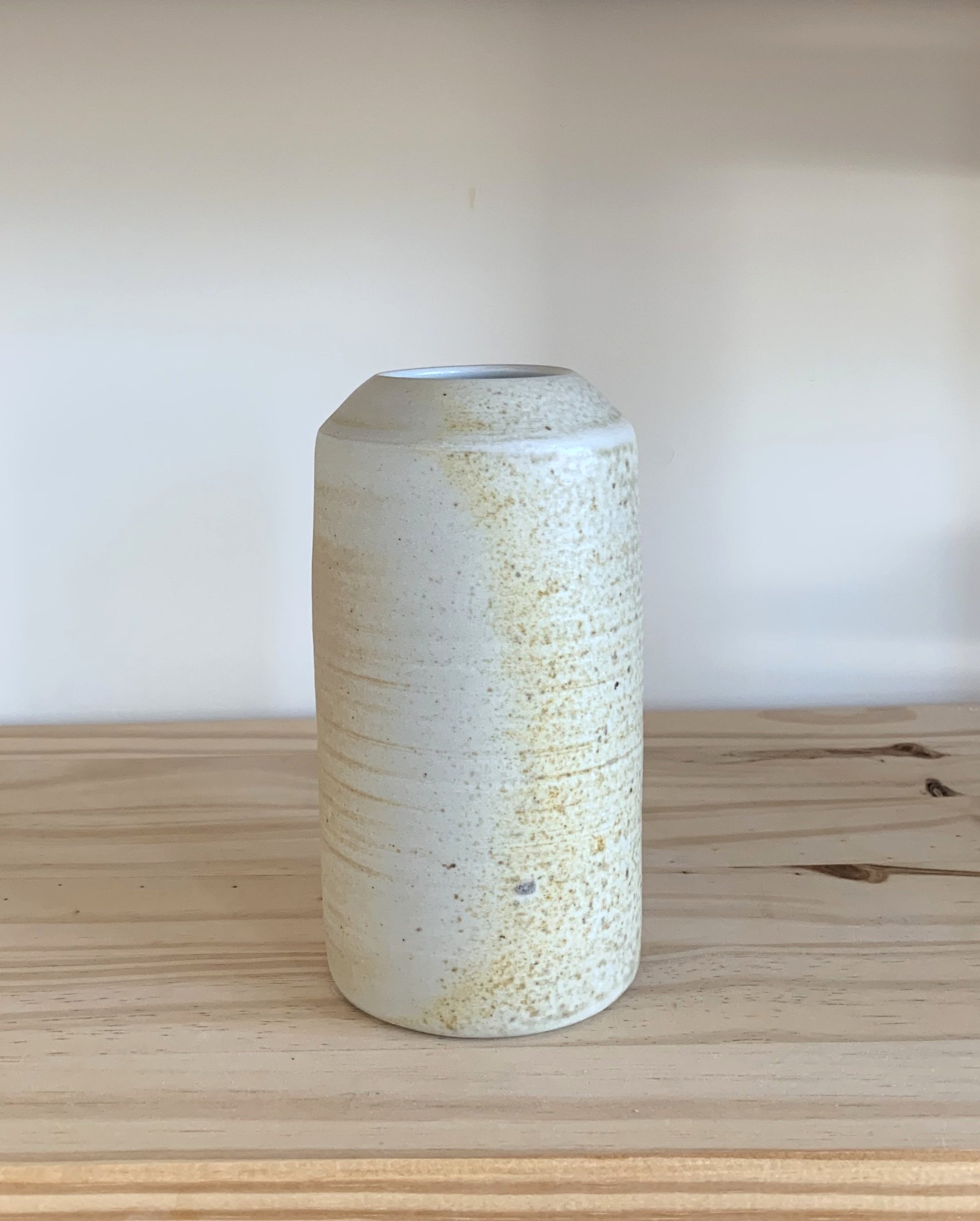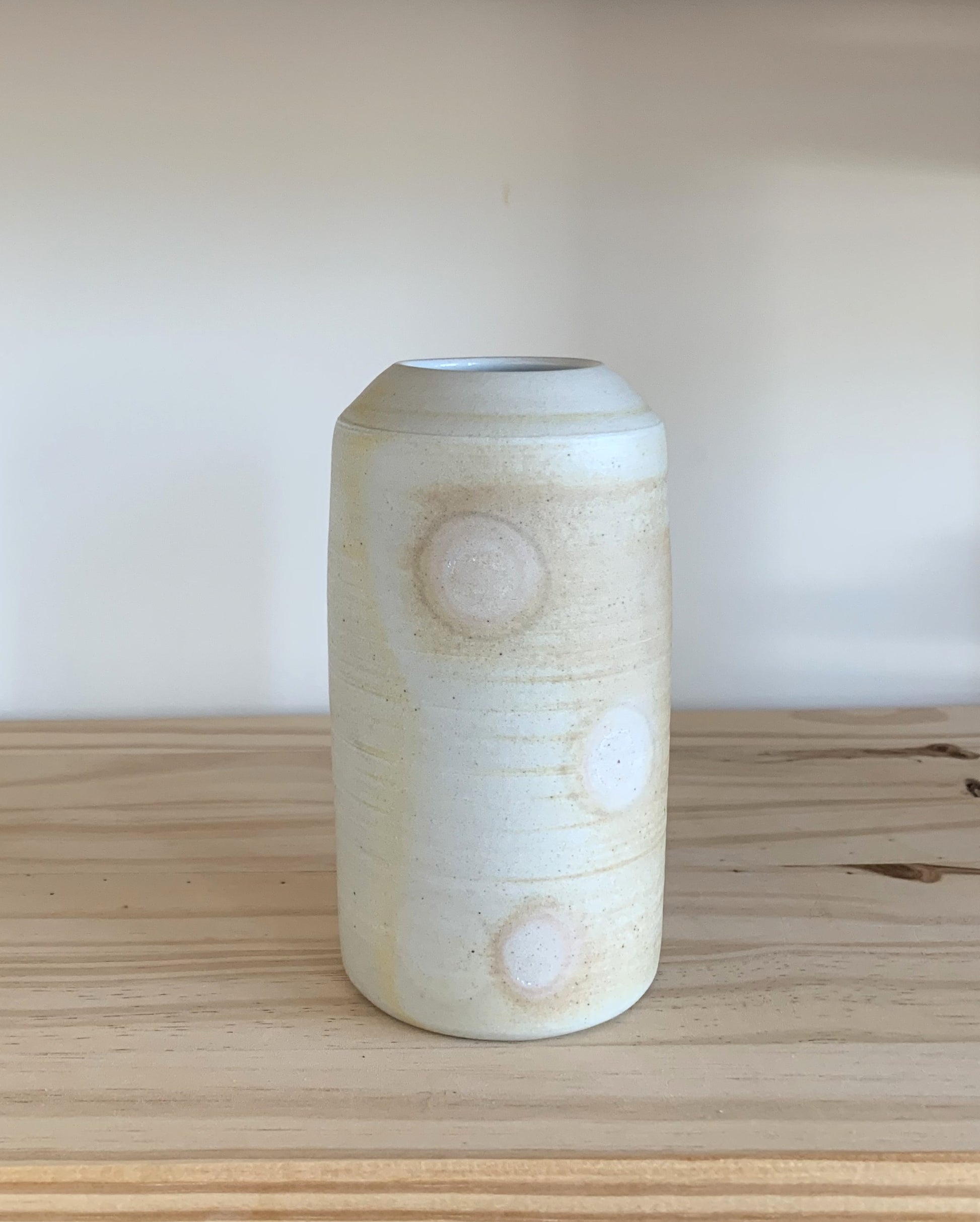 These porcelain wood fired column vases are part of our special wood fired collection. Hand crafted on the pottery wheel, these vases are fired in a special wood powered kiln to give the unique color palette. The colors and shine are the effect of wood ash, flame, and soda vaporizing in the kiln, travelling on the flames and landing on pots throughout the kiln. Due to this unique way of firing, each piece is 100% unique and cannot be replicated. These vessels are earthy, subtle and beautifully organic.