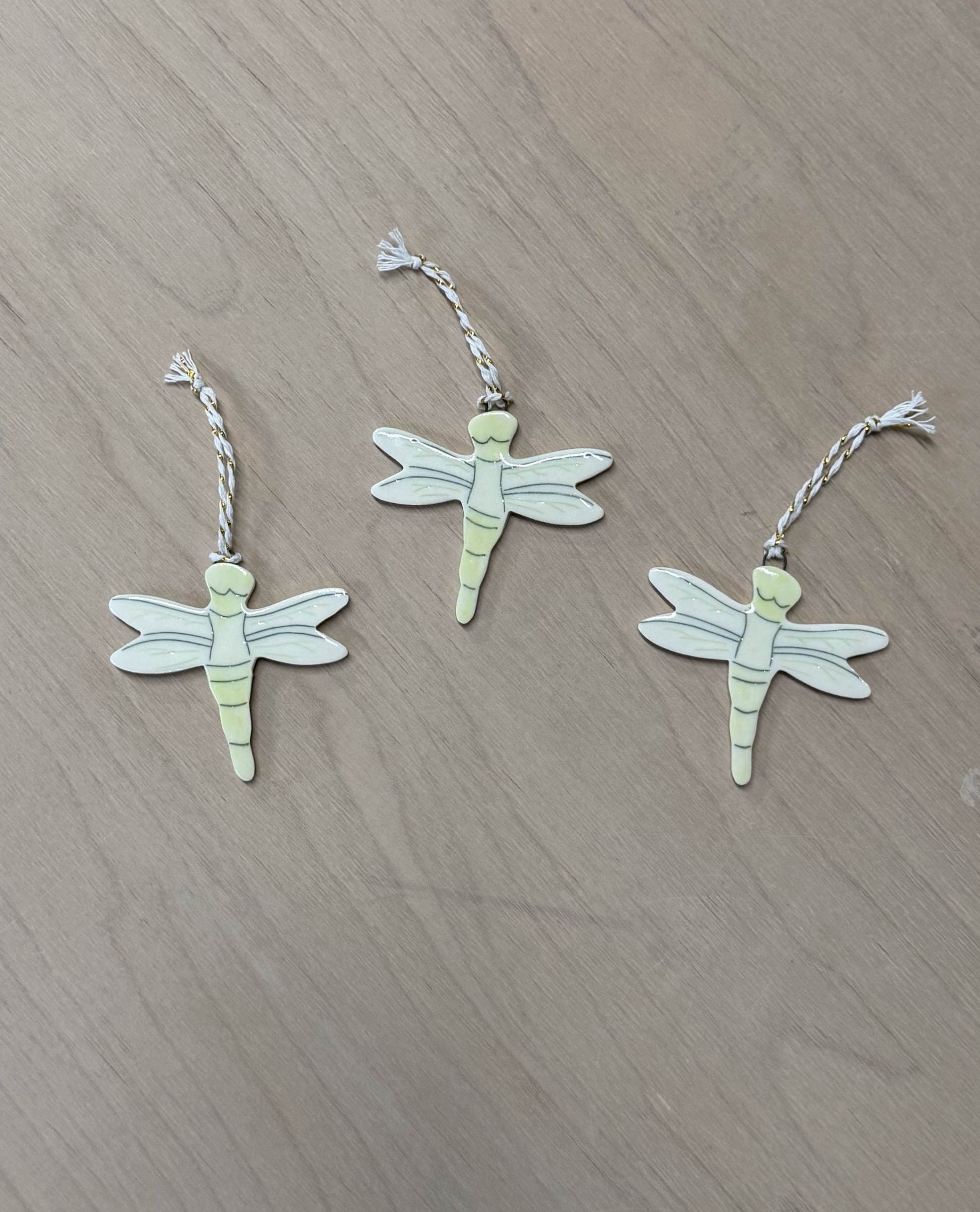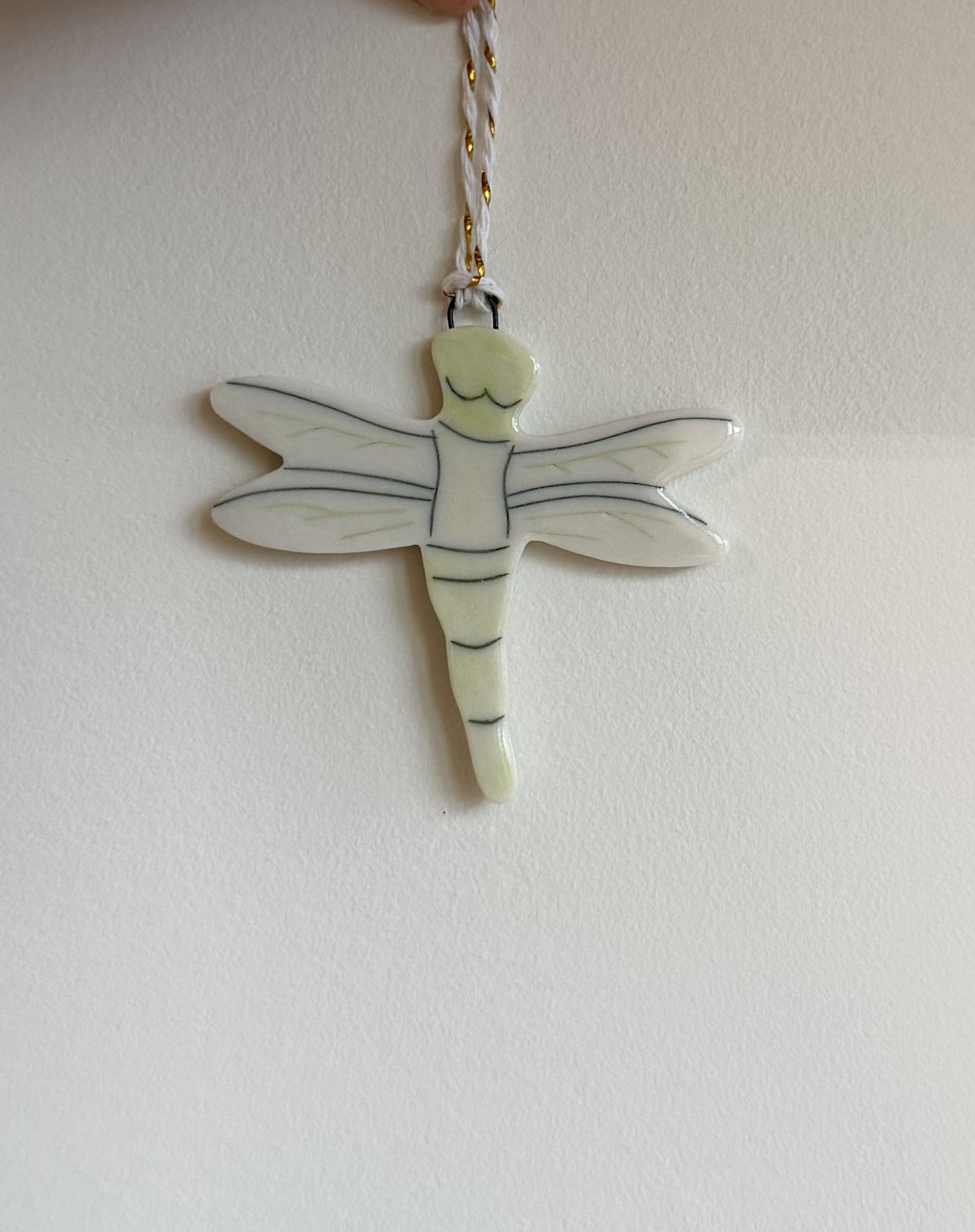These elegant dragon flies are illustrated by hand, making each one unique. They are carved and inlaid with dark green and yellow underglaze before finishing with a wash of lime green and a clear glossy glaze. The lime green veins in the wings are a subtle touch. This ornament can also be purchased in a swarm bundle of three insects.