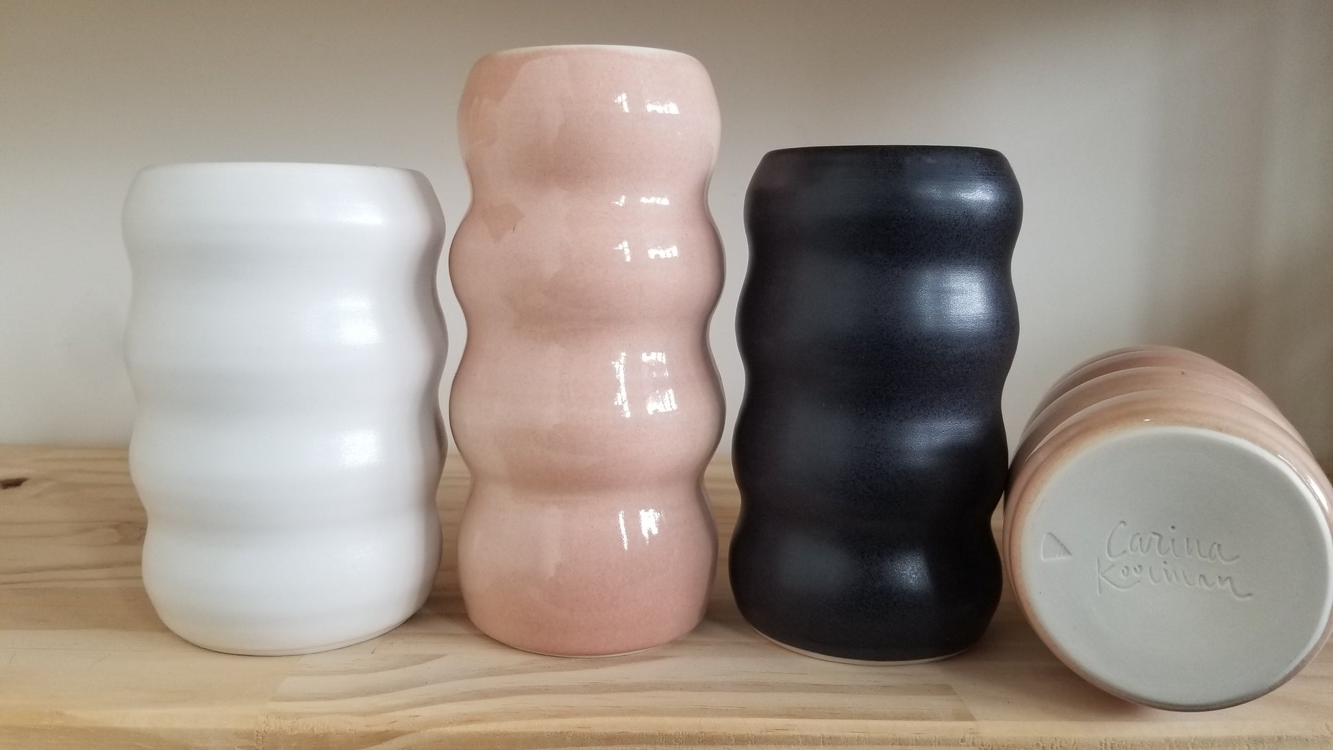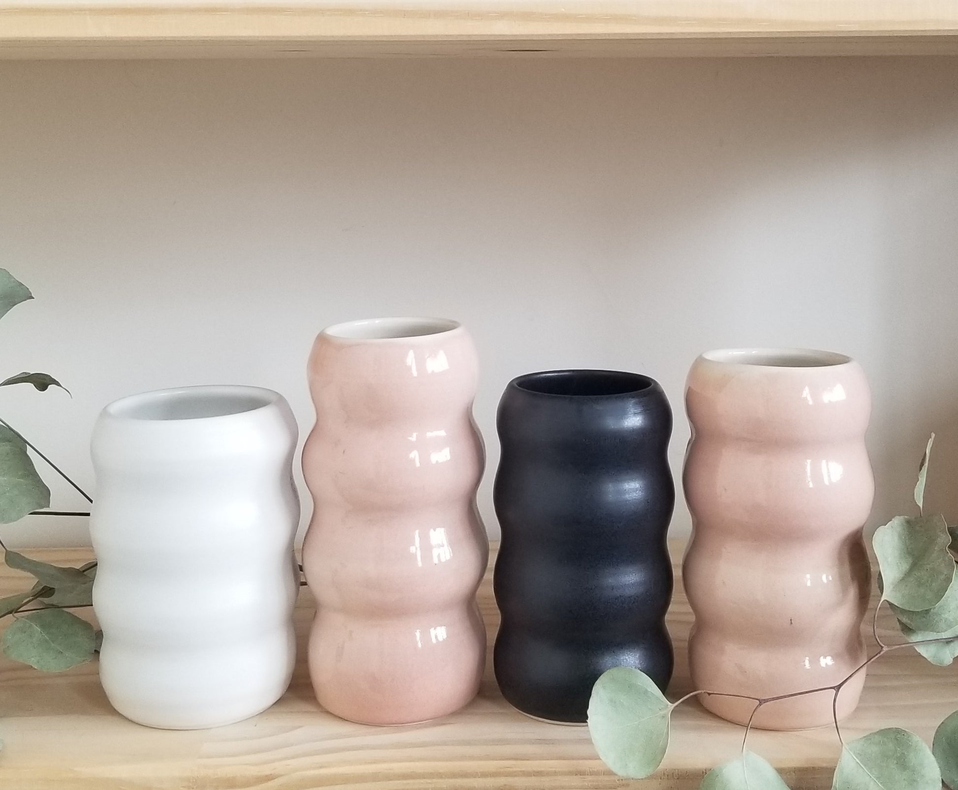Vase A: The curves on this vase are dipped in our matte soy leche glaze. It measures approximately 6" tall and 3" wide.