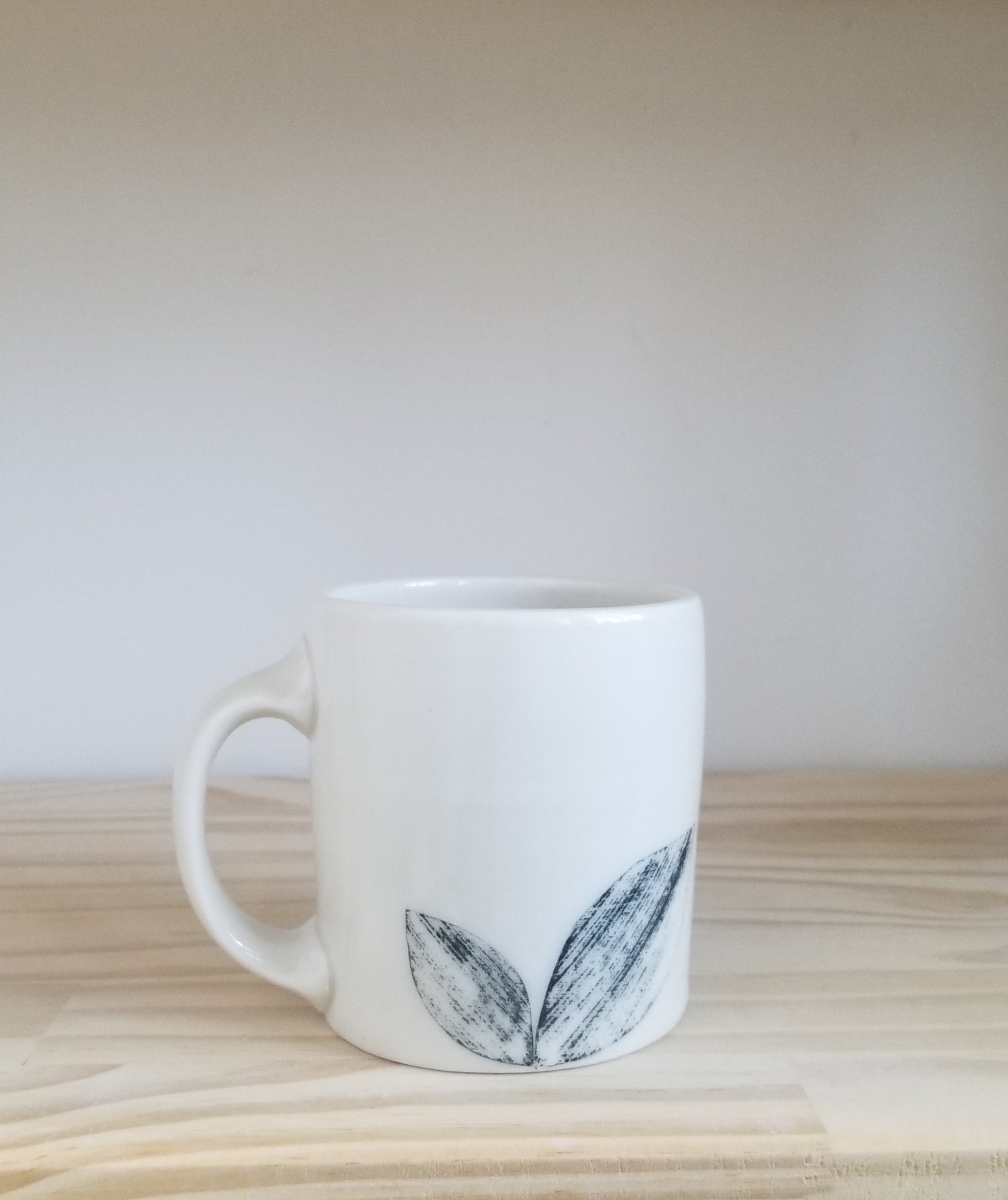 Each porcelain mug is hand thrown, handled, then carefully monoprinted with underglaze in a leaf motif, before being dipped in a clear glaze. These mugs are great for your morning cup of coffee, a late night sleepytime tea, or a serving of soup when you’re out of bowls. Make this your go to mug or gift it to your favorite friend!