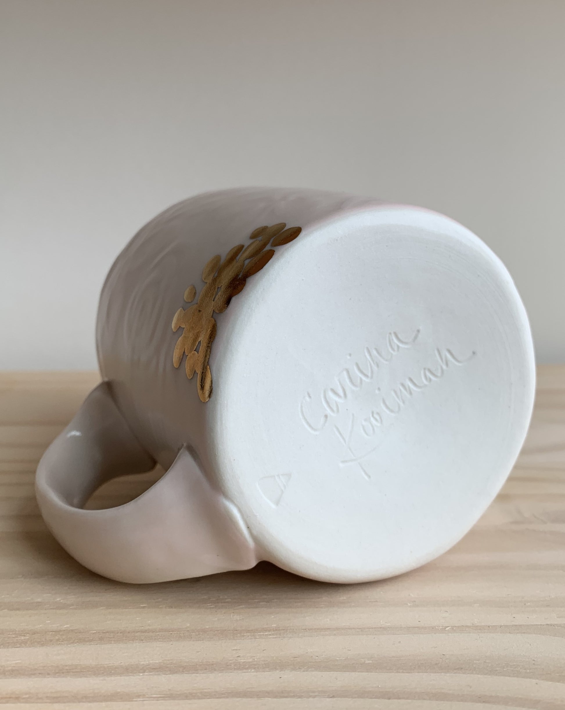 This mug is a real stunner! Wheel thrown and handled, this mug is then wax painted by hand in a floral motif before being water etched for a raised texture. After being dipped in a transparent pink glaze, this mug goes through a third and final firing for the 14k yellow gold glaze that is handpainted over several of the flowers. Great for your morning cup of coffee, a late night sleepytime tea, or whenever you need that extra special mug. This one is a true labor of love.