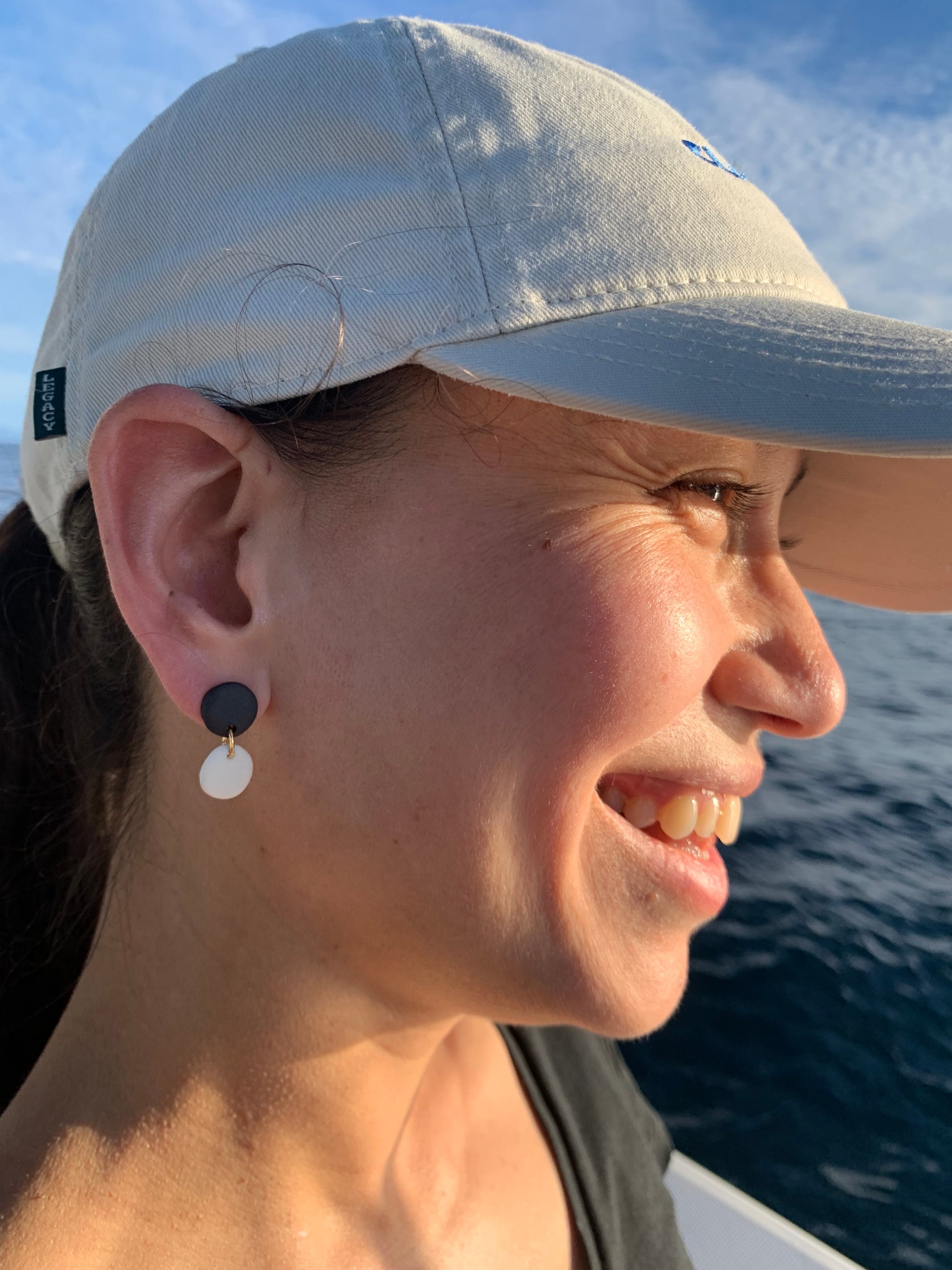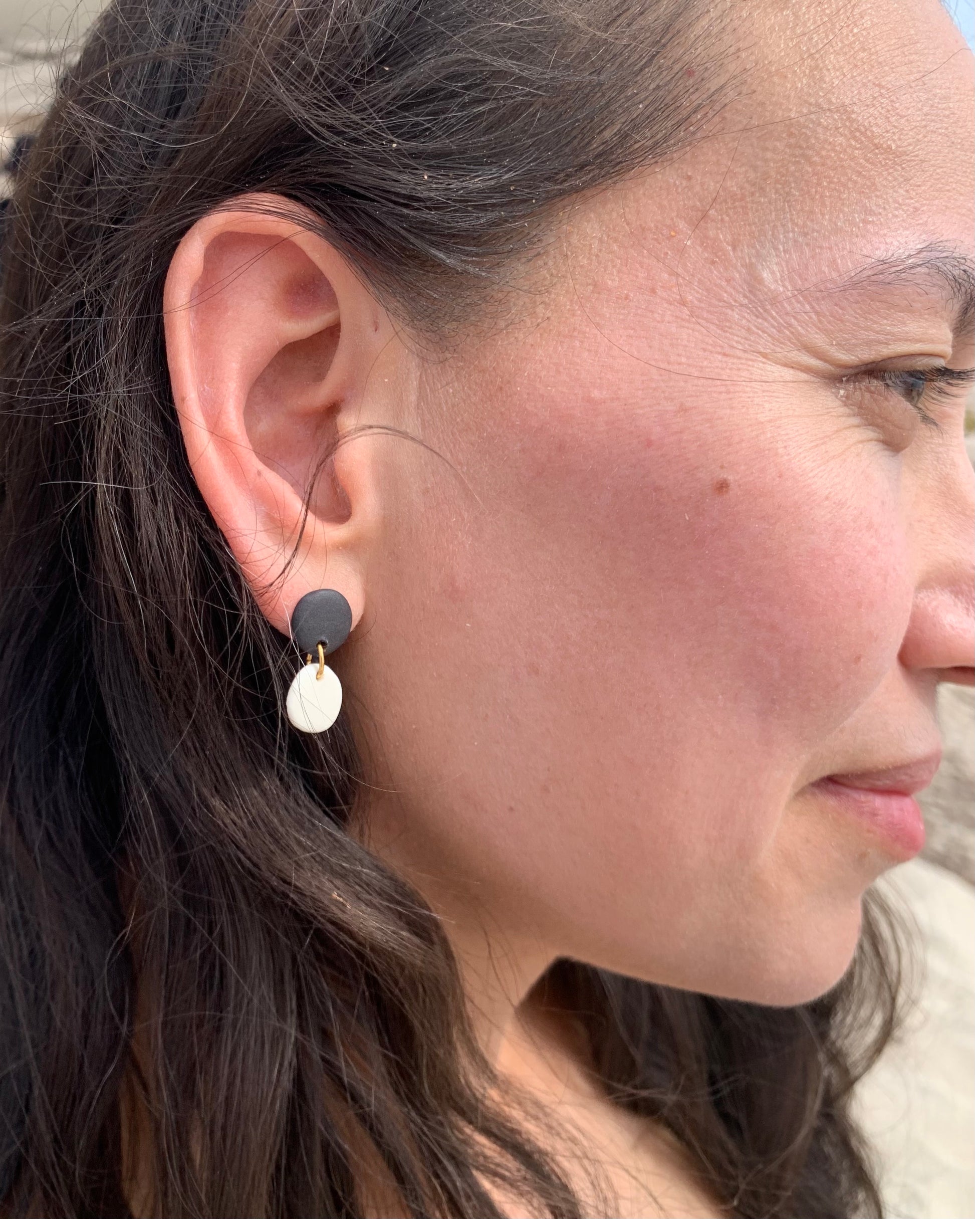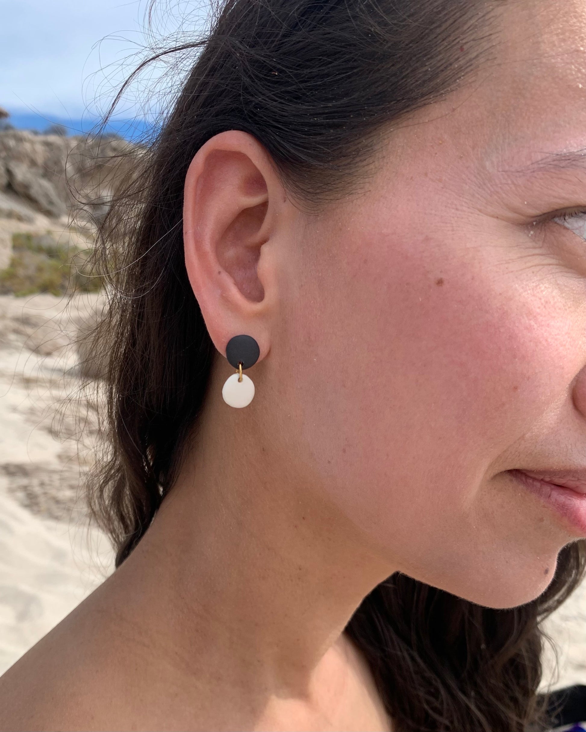 Dot Drops are made up of two hand formed porcelain disks, fastened by a gold plated ring. The top disk is stained black and the bottom is natural white. They are lightweight and have lovely movement. Hardware is hypoallergenic titanium.