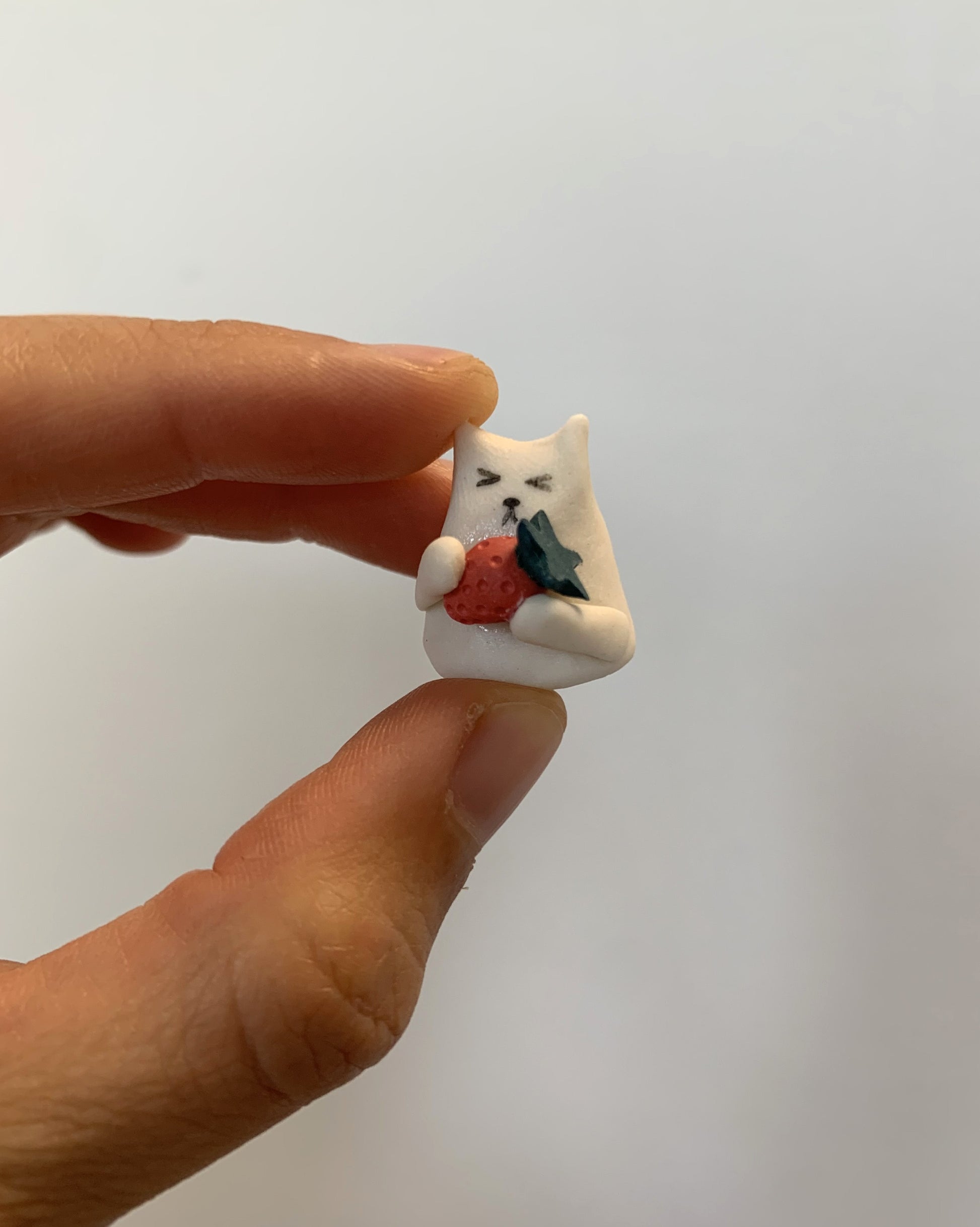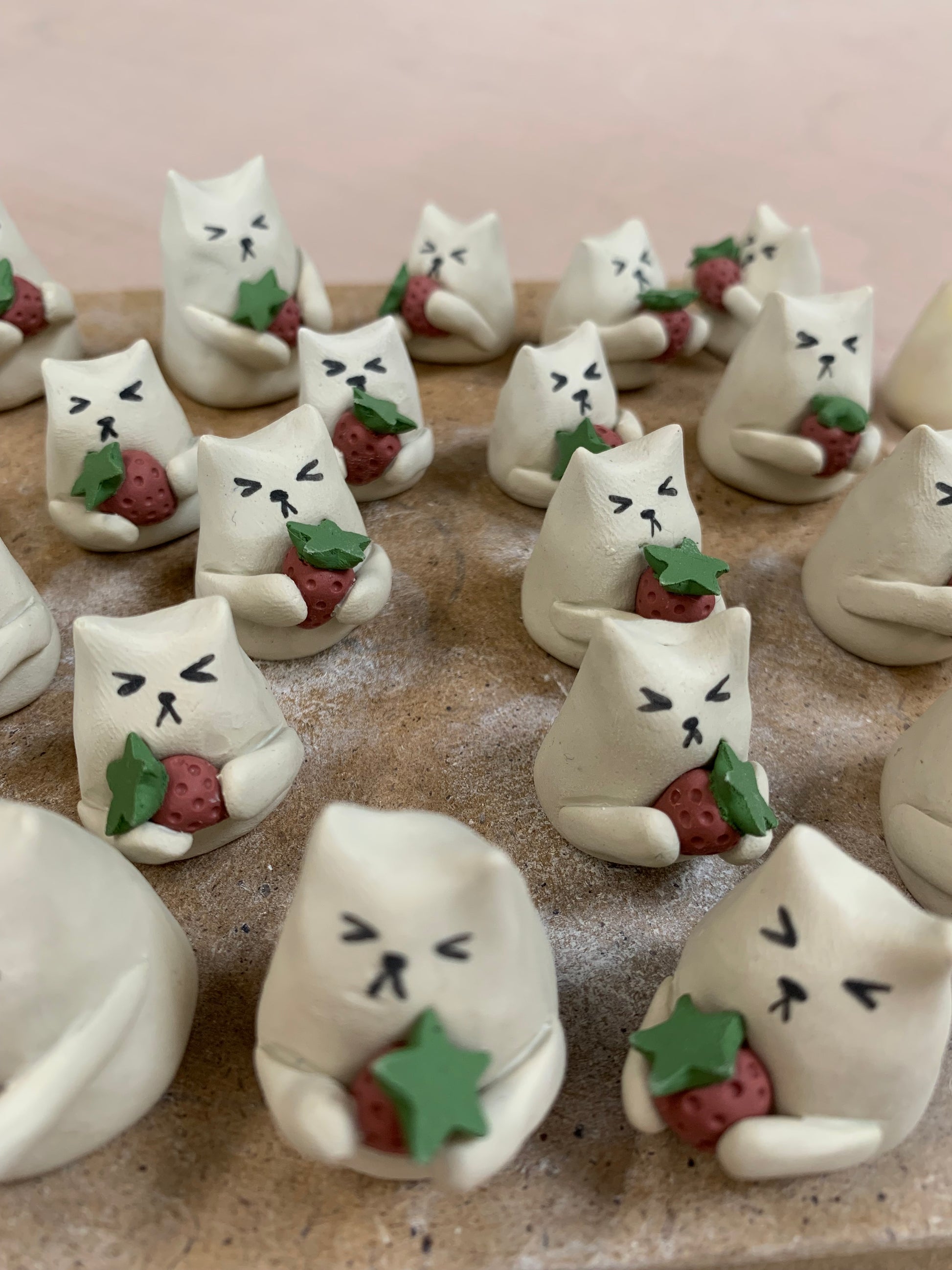 Nothing says "summer!" like a farm fresh strawberry--this miniature celebrates the season with a cat holding one dimpled strawberry! With colored porcelain details, these cats are sweet as can be. Ranging from 3/4 to 1 inch, each is handmade and unique.